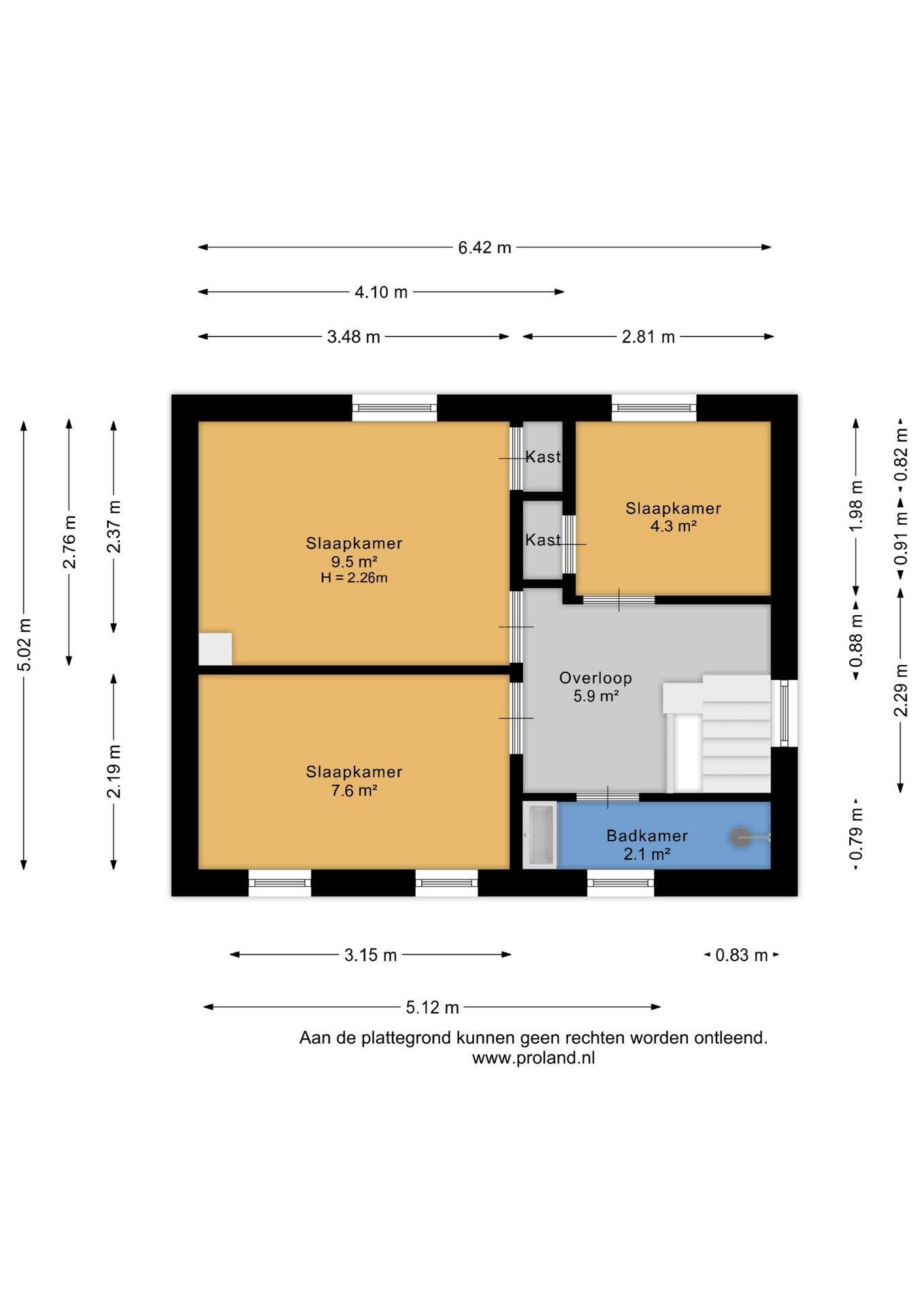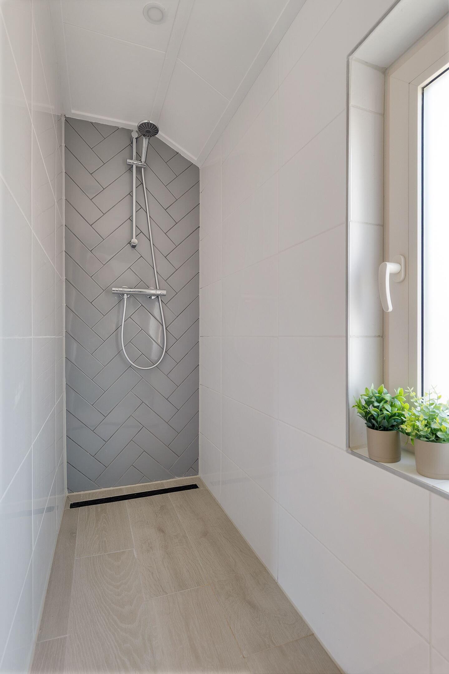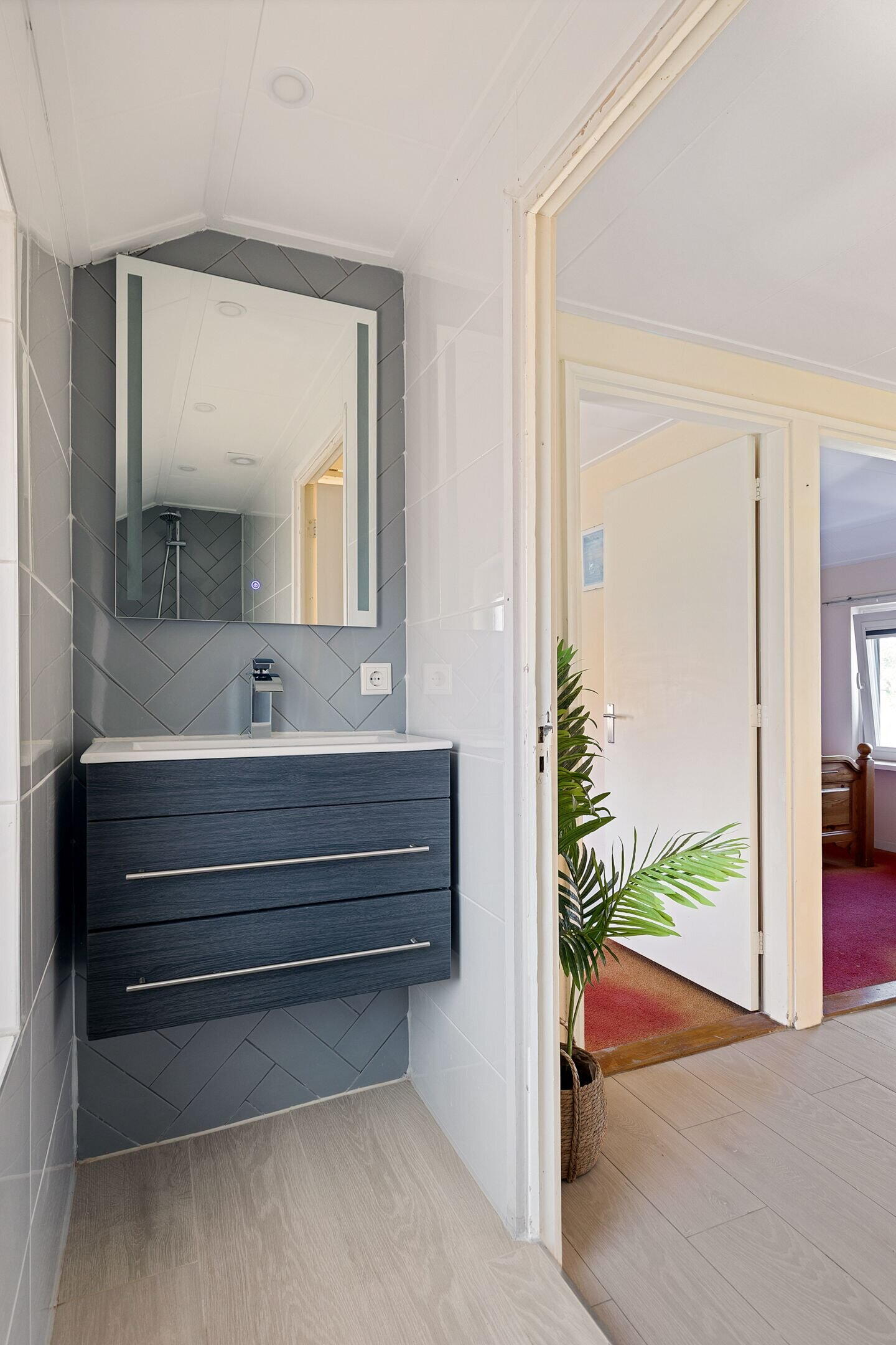 Overloop, drie slaapkamers (circa 9,5 m², 7,6 m² en 4,3 m²) en een recent vernieuwde badkamer (2025) met inloopdouche en wastafelmeubel.