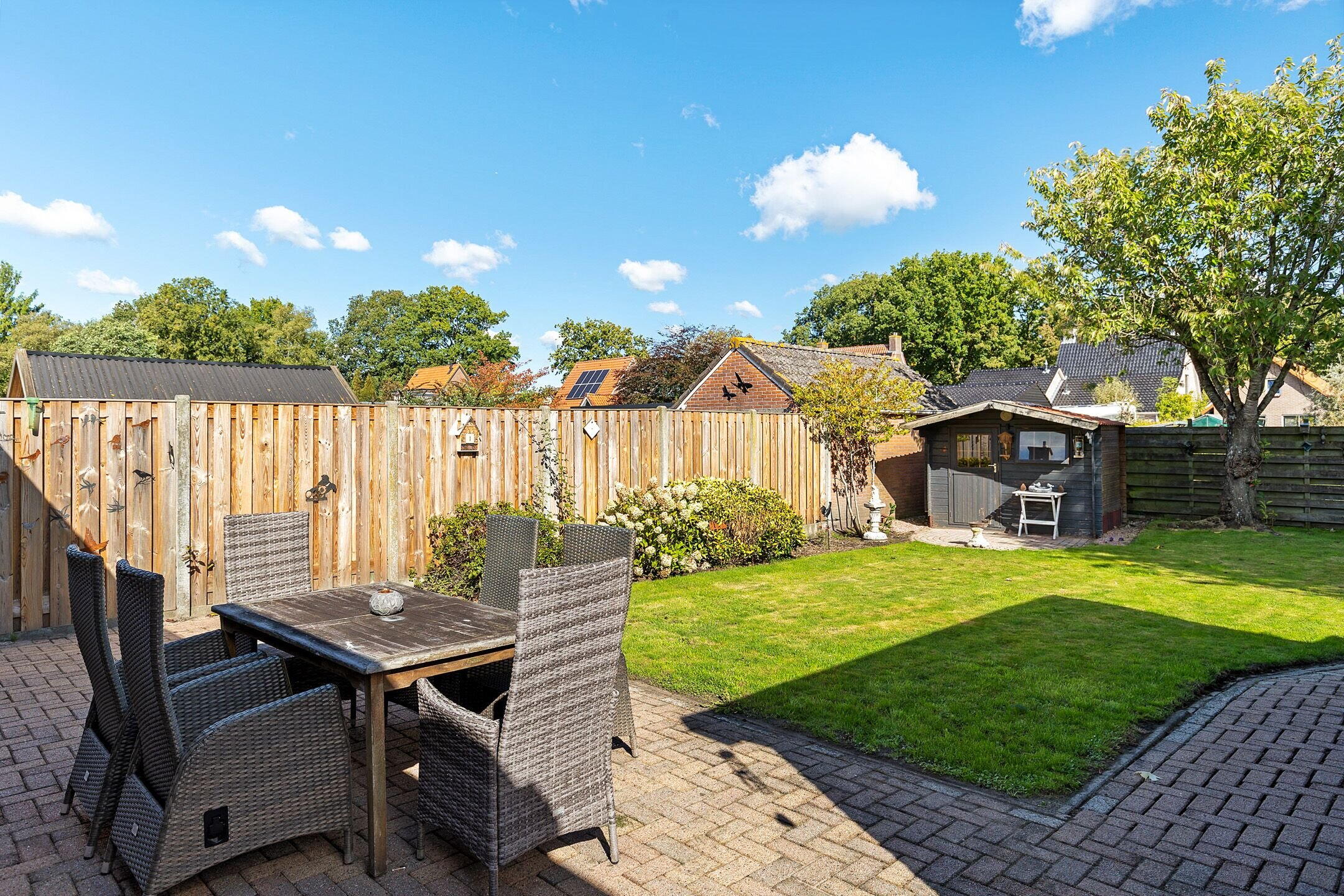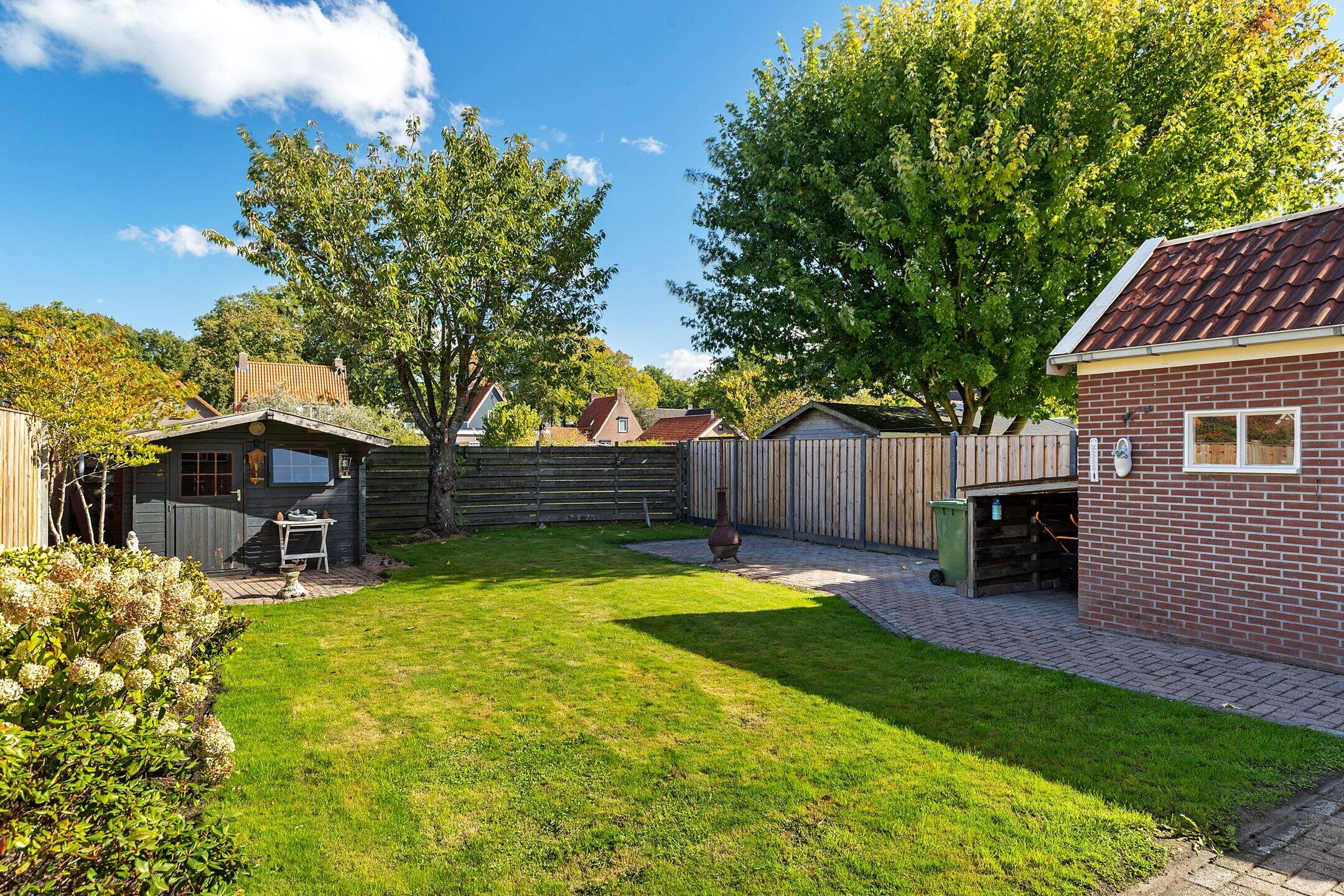 De diepe achtertuin (circa 18,5 m) ligt op het noordoosten en is onderhoudsvriendelijk aangelegd met gras en terrassen. Verder beschikt de tuin over een ruime, vrijstaande stenen schuur en een houten berging, ideaal voor opslag of hobbygebruik.